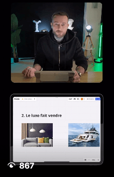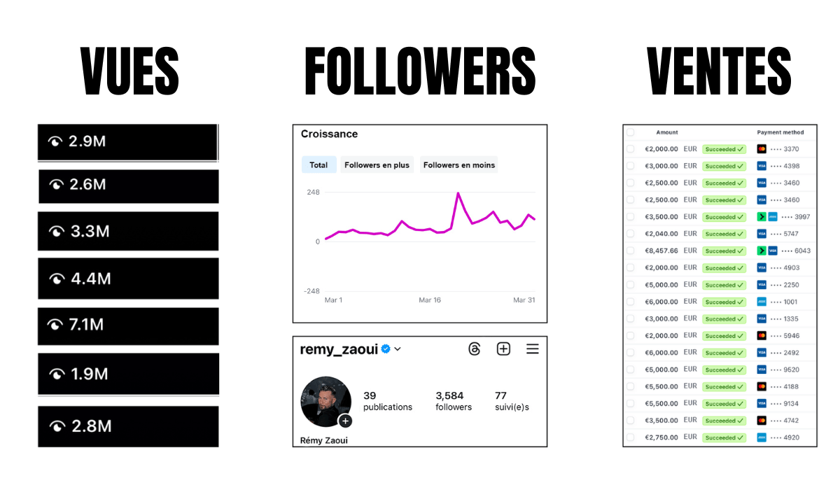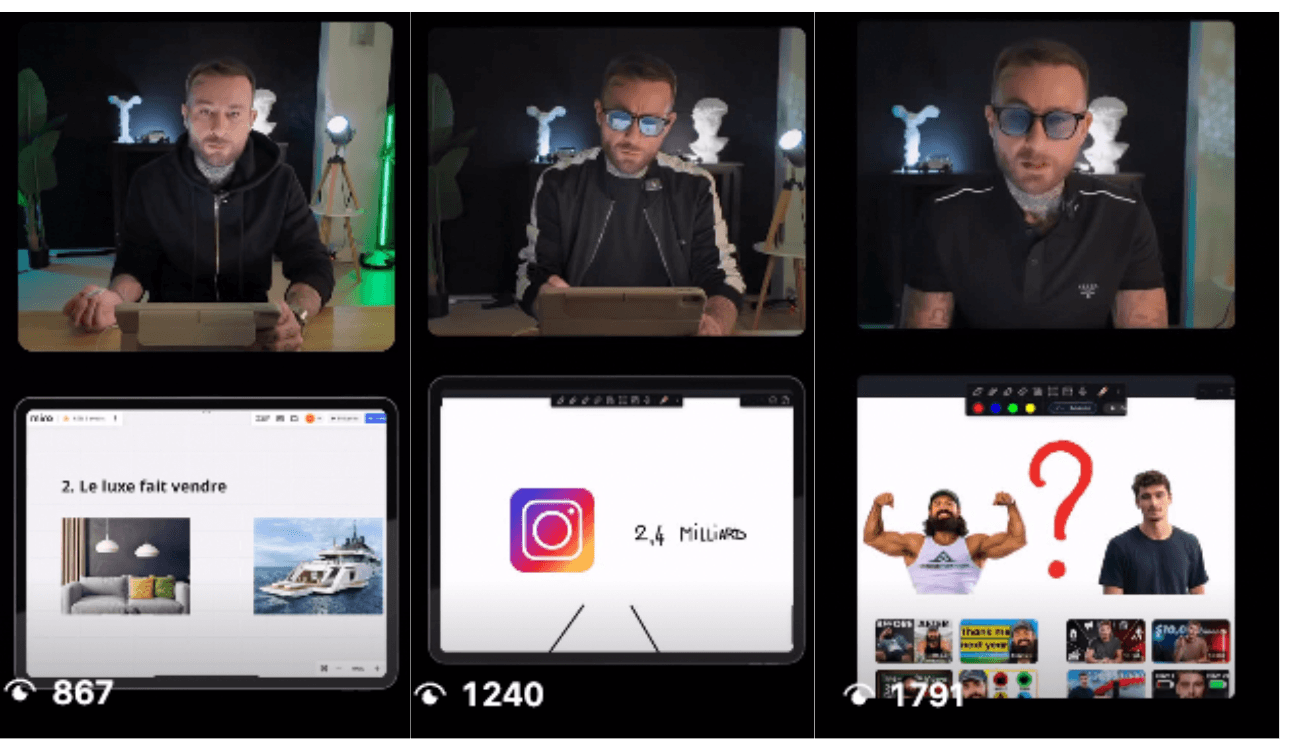 À la base, je ne comptais pas les vendre. Mais après être passé de 1 000 vues par vidéo à plus de 50 millions de vues en 90 jours, mon équipe et moi avons rassemblé toutes nos meilleures idées dans un fichier. On a décidé d’en faire un produit accessible pour aider des centaines d’entrepreneurs à exploser leur marque sur Instagram.